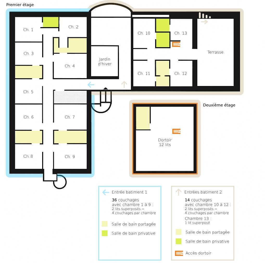 Le centre propose 67 couchages répartis sur 14 chambres et 1 dortoir dans deux blocs à l’étage. Les chambres, équipées de lits superposés, offrent un hébergement pratique pour les séjours en groupe. Certaines disposent de leur propre salle d’eau (douche, lavabo, WC), d’autres partagent des sanitaires communs.